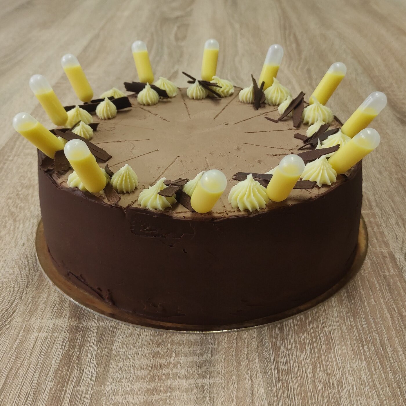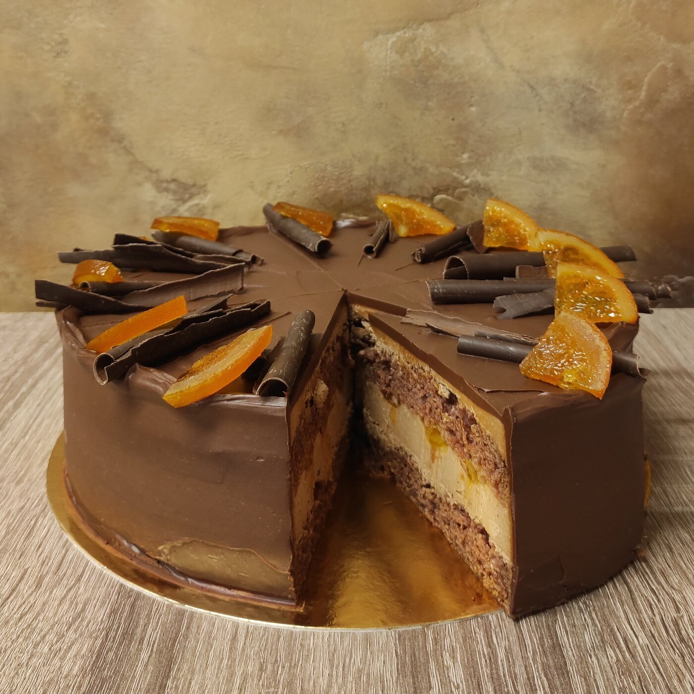 Extra čokoládový dort s osvěžujícím pomerančovým vkladem a pevnějším korpusem z podmáslí zahalený do čokoládového kabátku. Zdobené čokoládovými hoblinami a kandovaným pomerančem