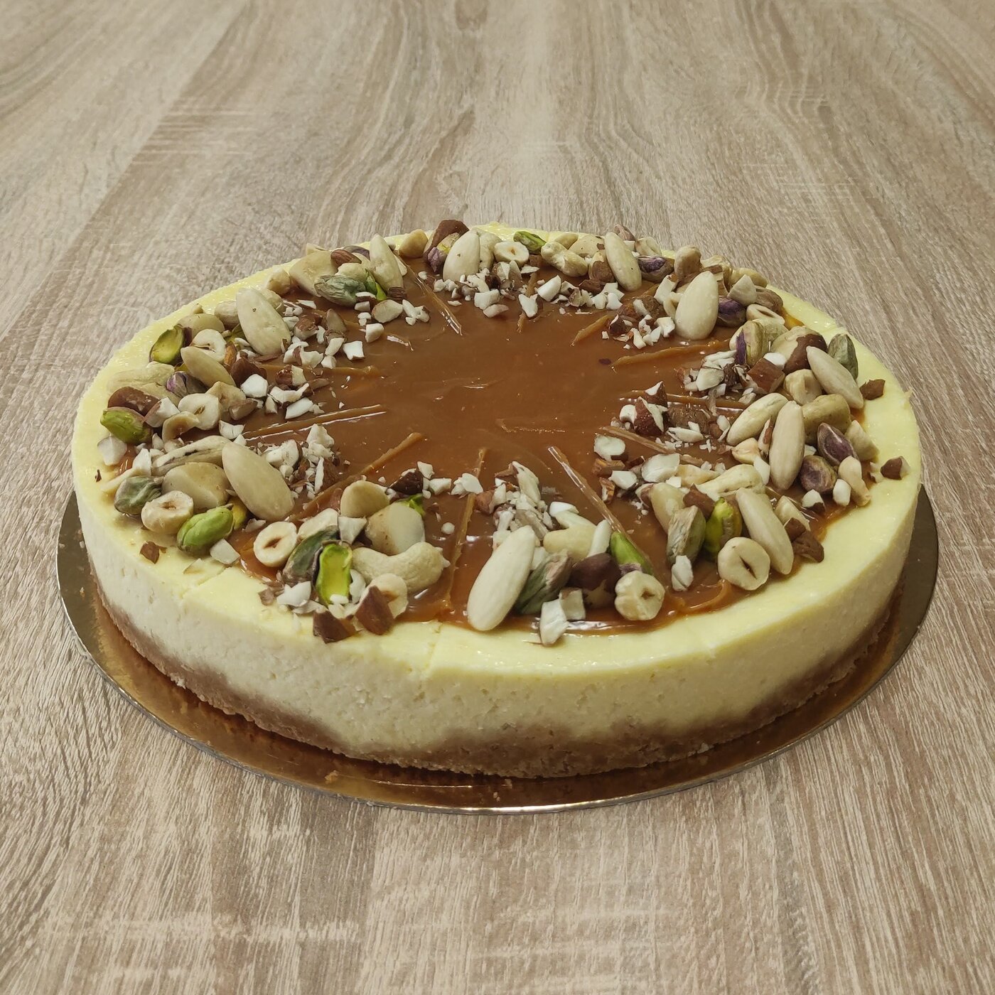 Pečený cheesecake slazený bílou čokoládou, ozdobený mléčným karamelem a směsí ořechů.