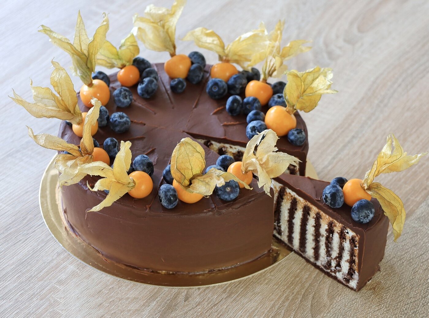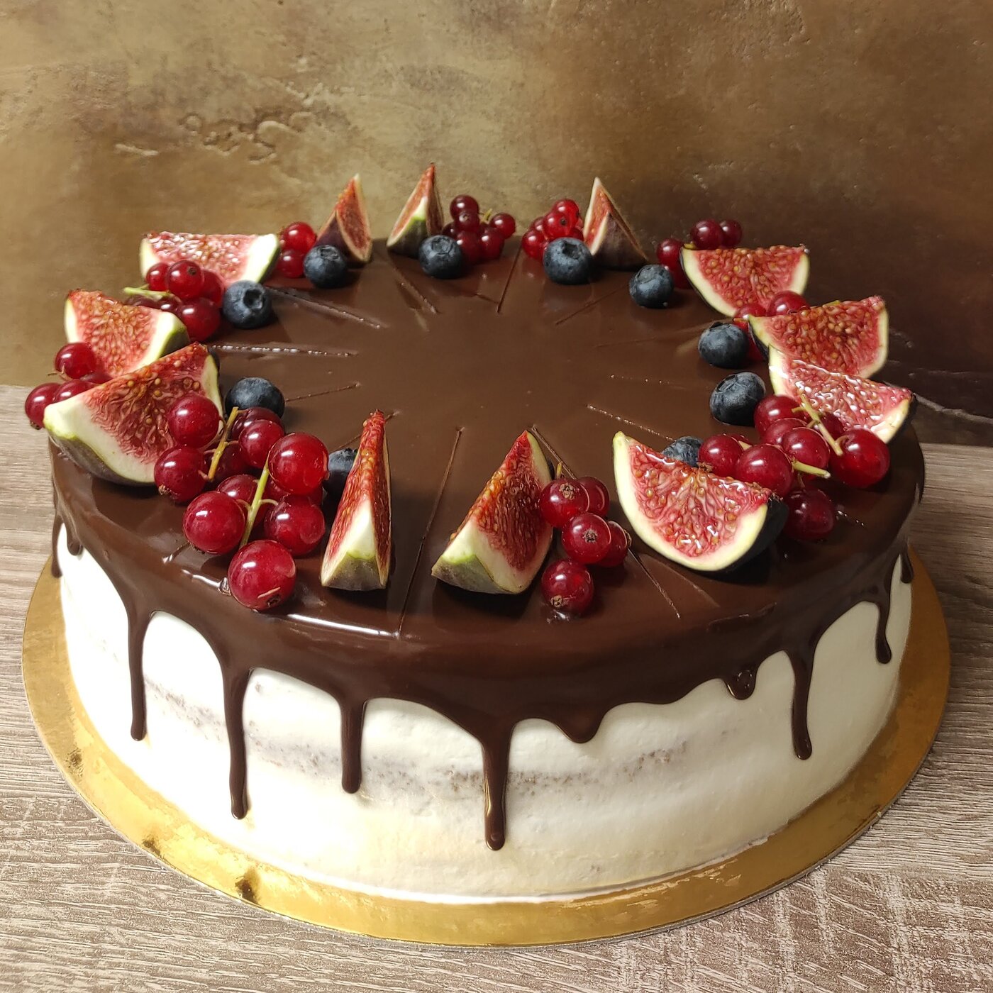 Kakaový piškot s tvarohovým krémem (dvě vrstvy korpusu, dvě vrstvy krému) přelité čokoládovou ganache a zdobené čerstvým ovocem.