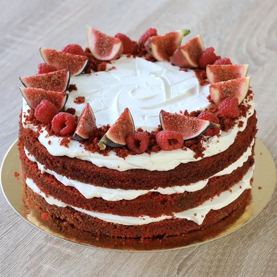 Red velvet je typicky červený korpus pevnější struktury se smetanovým krémem. Patří do zástupců „naháčů“ jeho 3 vrstvy krému a 3 vrstvy piškotu jsou z boku přiznané, nijak neobmazané. Vršek je zdobený sezónním ovocem a posypaný drobečky korpusu.