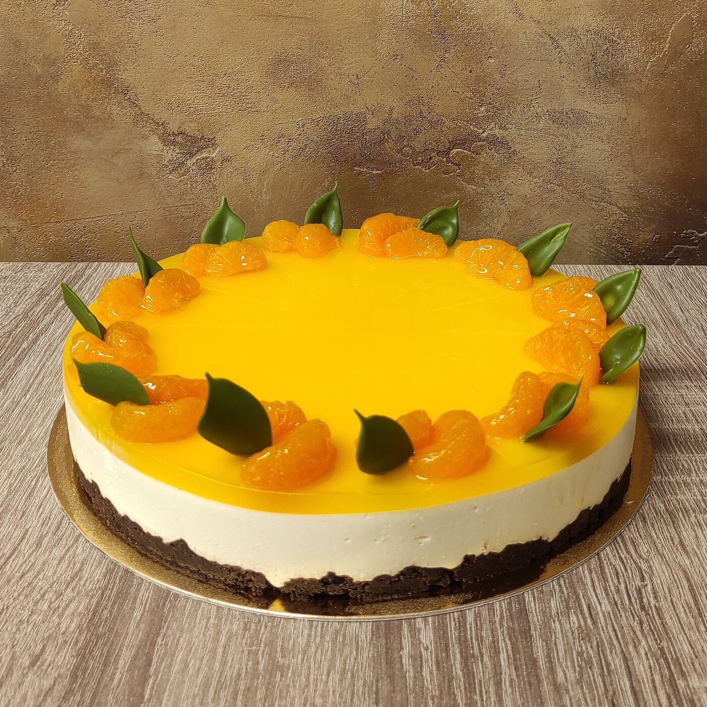Složení: čokoládový krém, mascarpone, smetana, podmáslový kakaový korpus, pomerančový vklad, kandovaný pomeranč, čokoládová ganache