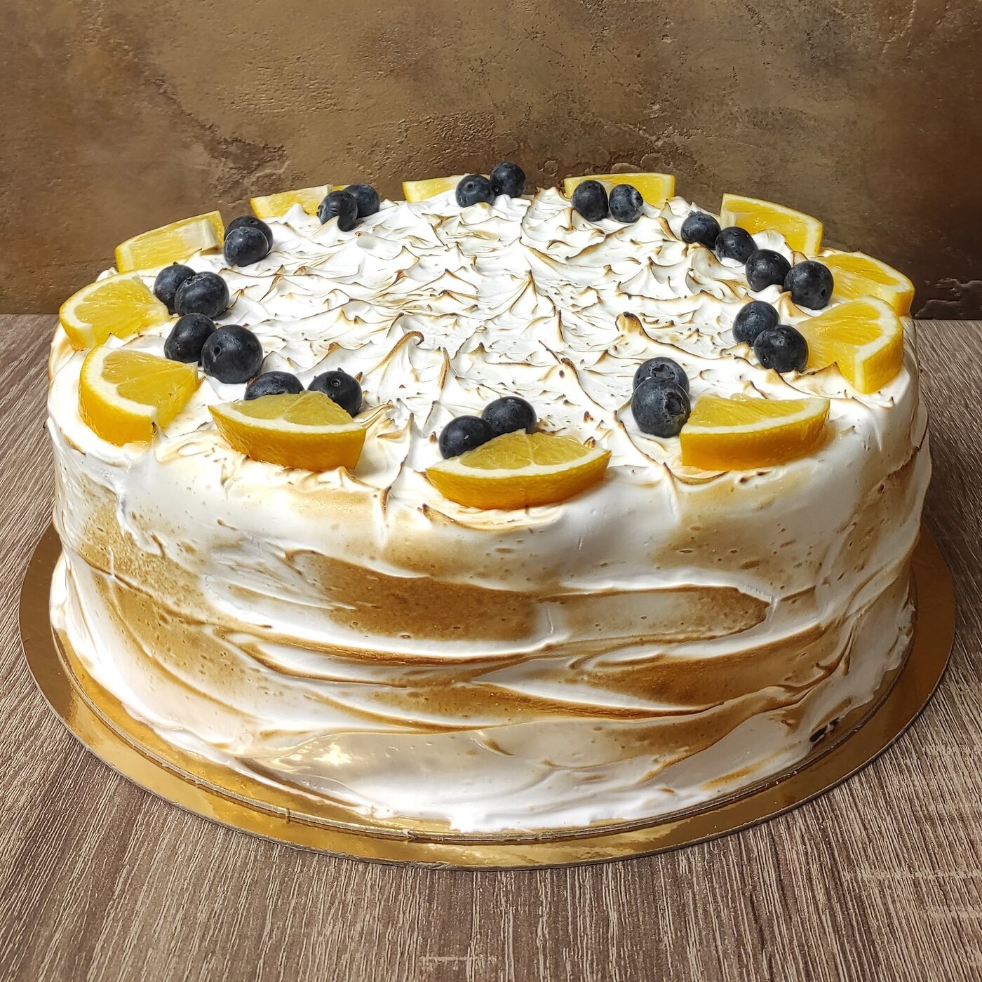 Citrónový piškot, mascarpone krém a jako osvěžující vklad maracujový vařený krém. Celý dort je zahalen do bílkového sněhu s lehce karamelizovaným povrchem. Zdobený ovocem.