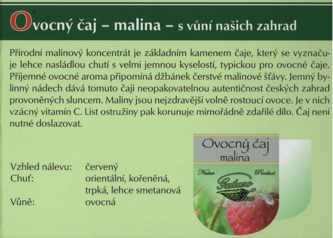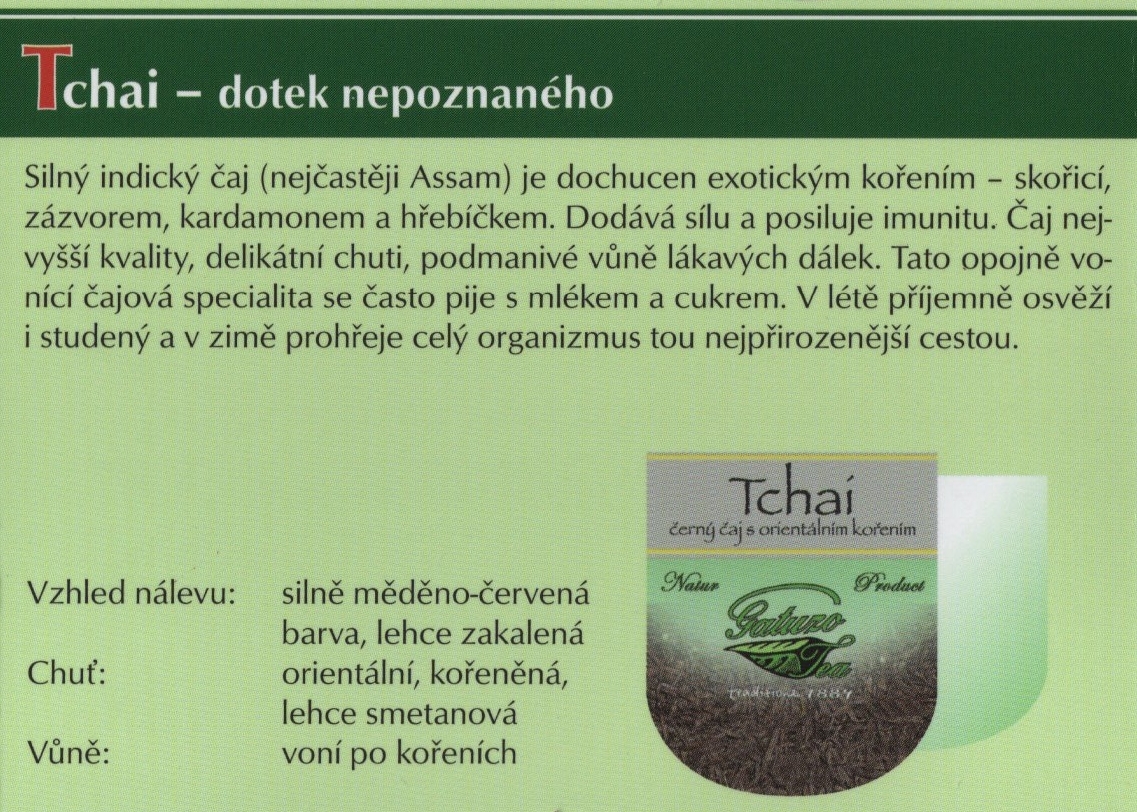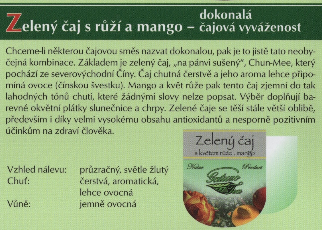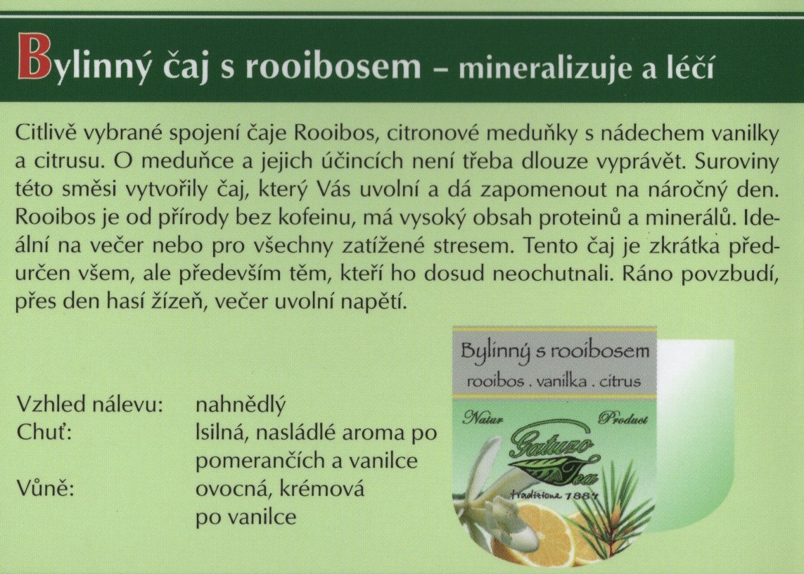 Výběrové čaje Gatuzo Tea jsou čistým přírodním produktem bez chemických dochucovadel, barviv a příměsí. Při jejich výrobě je kladen vysoký důraz na kvalitu a zpracování jednotlivých surovin. Tyto čaje si zamilujete pro jejich nezaměnitelnou chuť a vůni. Šálek čaje Gatuzo Tea je příjemným zastavením v rušném koloběhu dne, společníkem osamělých chvil i přátelských posezení, osvěžení těla i pohlazením duše.
