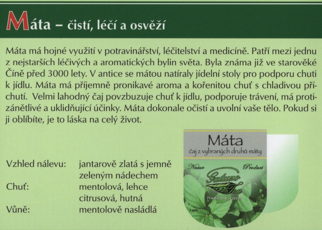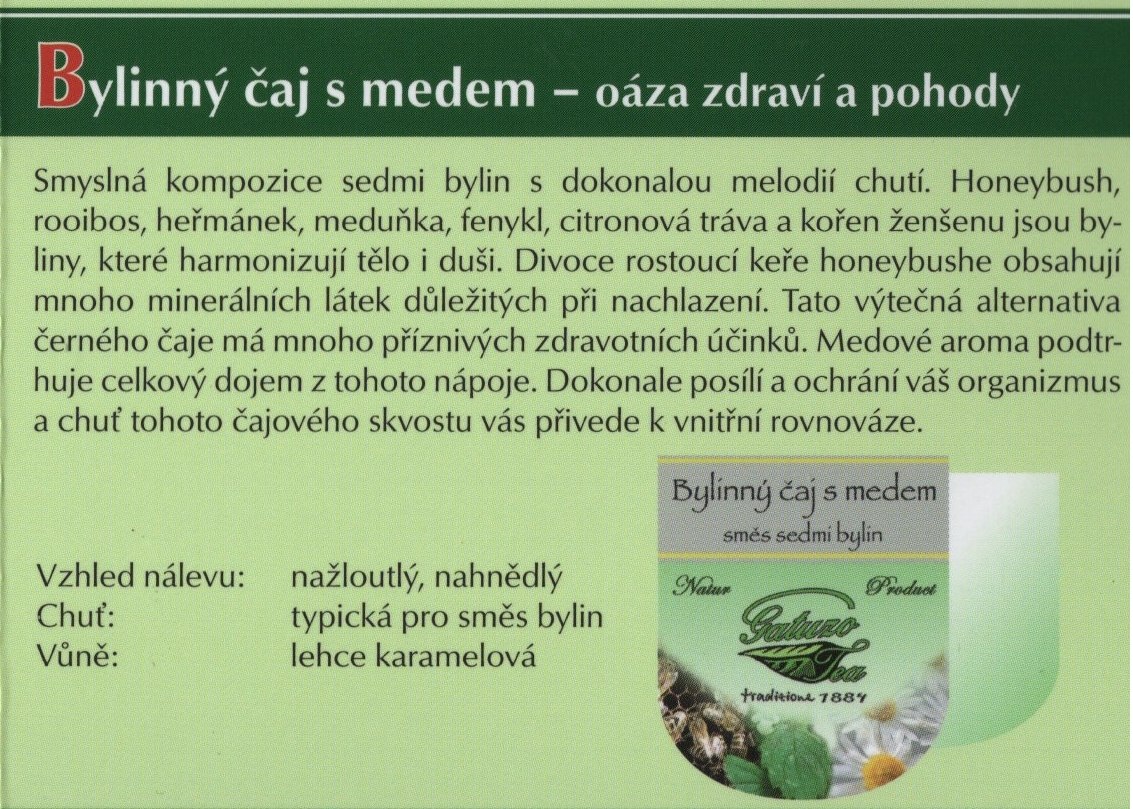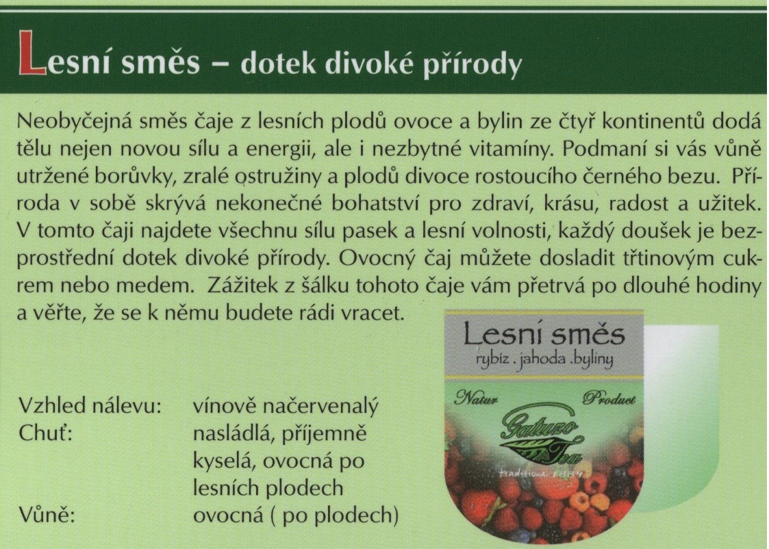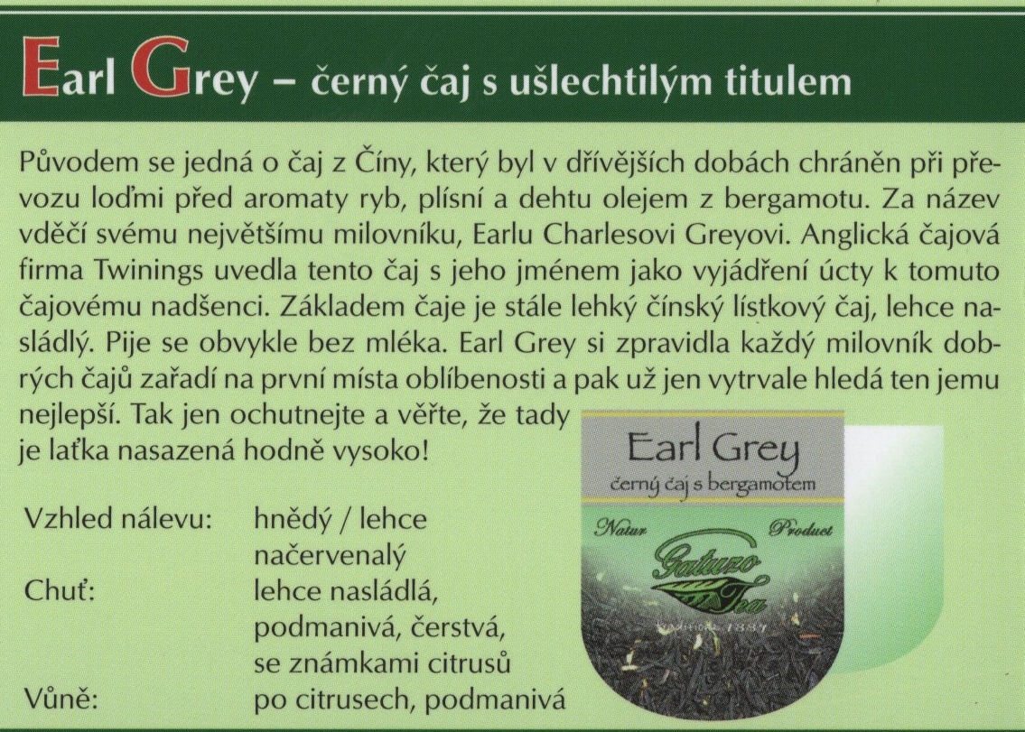 Výběrové čaje Gatuzo Tea jsou čistým přírodním produktem bez chemických dochucovadel, barviv a příměsí. Při jejich výrobě je kladen vysoký důraz na kvalitu a zpracování jednotlivých surovin. Tyto čaje si zamilujete pro jejich nezaměnitelnou chuť a vůni. Šálek čaje Gatuzo Tea je příjemným zastavením v rušném koloběhu dne, společníkem osamělých chvil i přátelských posezení, osvěžení těla i pohlazením duše.