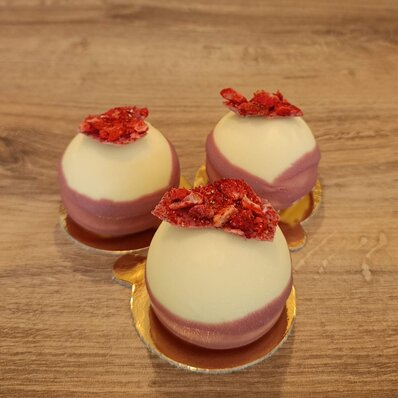 Dezert namočený v bílé čokoládě a ozdobený proužkem ruby čokolády a lyofilizovanou jahodou. Uvnitř je jemný krém ze smetany, mascarpone a bílé čokolády s jahodovým vkladem uvnitř, položený na křupavém crumble v karamelizované bílé čokoládě.