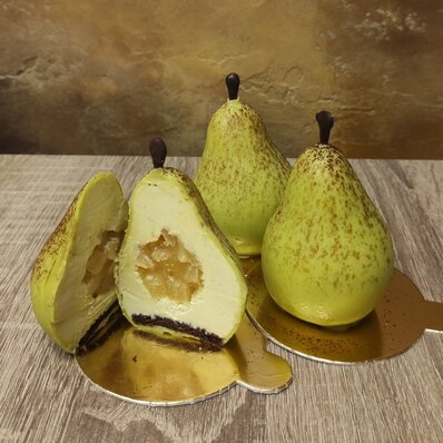 Svěží dezert ve tvaru hrušky z mascarpone, smetany, pistácií a čokolády skrývající v sobě šťavnaté hruškové compoté a položený na kakaovém korpusu.