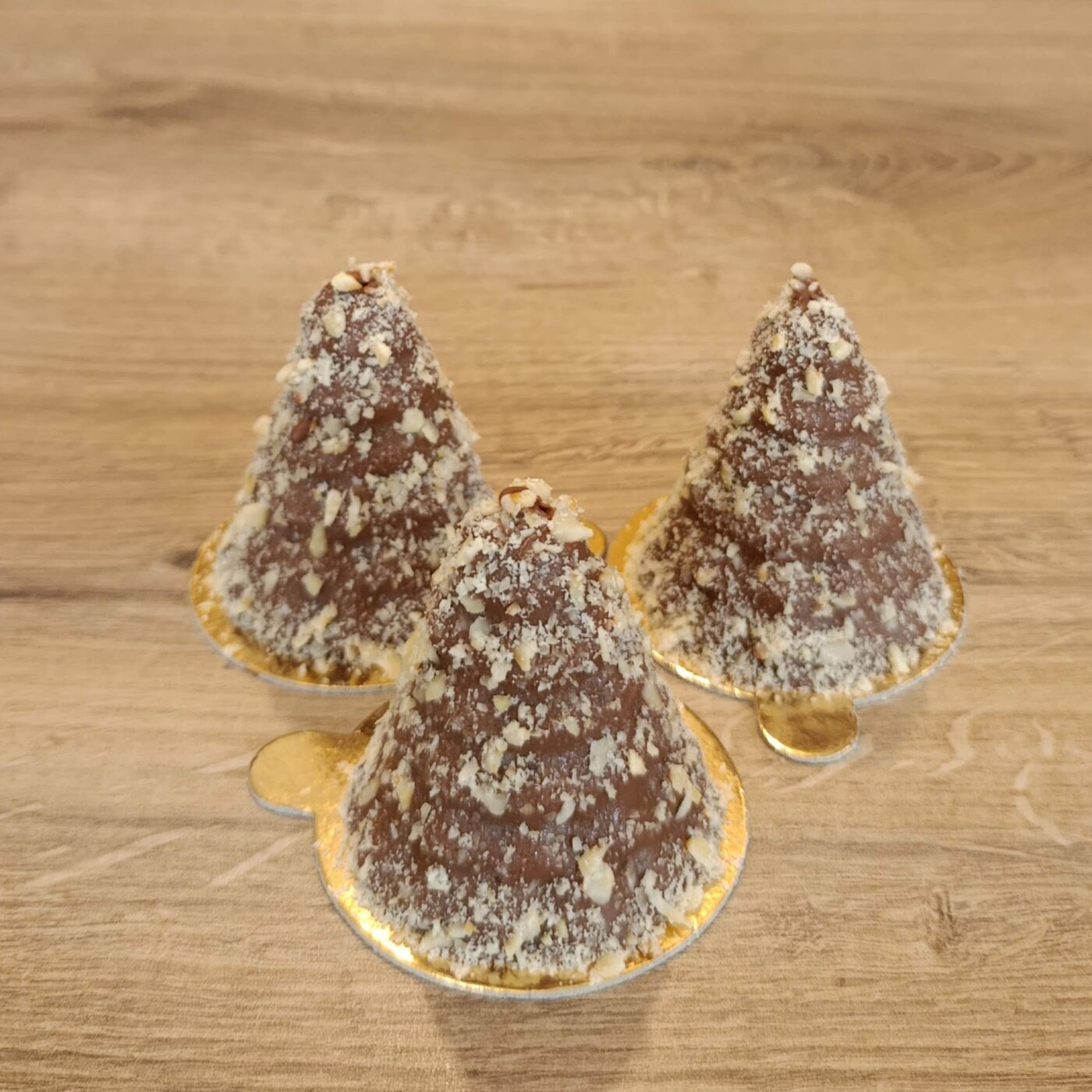 Toto je zákusek, který ocení milovníci toffifee, protože v něm je lískooříškový krém z mléčné čokolády s karamelovým vkladem a křehkým buflerem. Celý stromeček je přelitý mléčnou čokoládou a sypaný sekanými blanšírovanými lískovými oříšky.